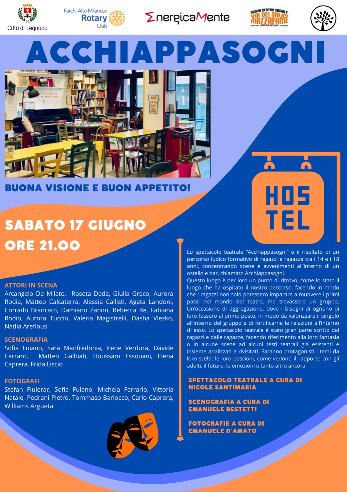Sabato 17 giugno alle 21.00 si terrà l’ultimo atto di ACCENDI IL TUO TALENTO, il progetto in collaborazione tra Centro Pertini – Il Salice e Rotary che per tutto l’anno ha tenuto impegnati oltre trenta ragazzi in tre corsi diversi (Teatro, Scenografia e Fotografia) che si concluderà con lo spettacolo teatrale “ACCHIAPPASOGNI”. Vi aspettiamo! ❤️