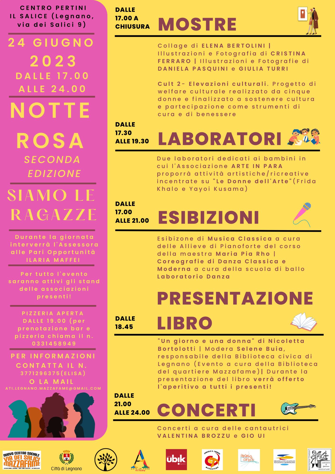 NOTTE ROSA – Seconda Edizione Posted on Giugno 19, 2023 by Max Sabato 24 giugno torna la NOTTE ROSA, un evento che inizierà alle 17.00 e si concluderà alle 24.00 ricco di iniziative, momenti di intrattenimento e di riflessione tutti al femminile! 🌙🌸 Altri articoli di interesse: Zumba e Zumba Kids FITNESS Sabato 26.11: JACK THE SMOKER + G KRES + AXOS @SALICE LEGNANO! 1° SETTEMBRE: EIFFEL 65 @ DISTRICT FESTIVAL LEGNANO