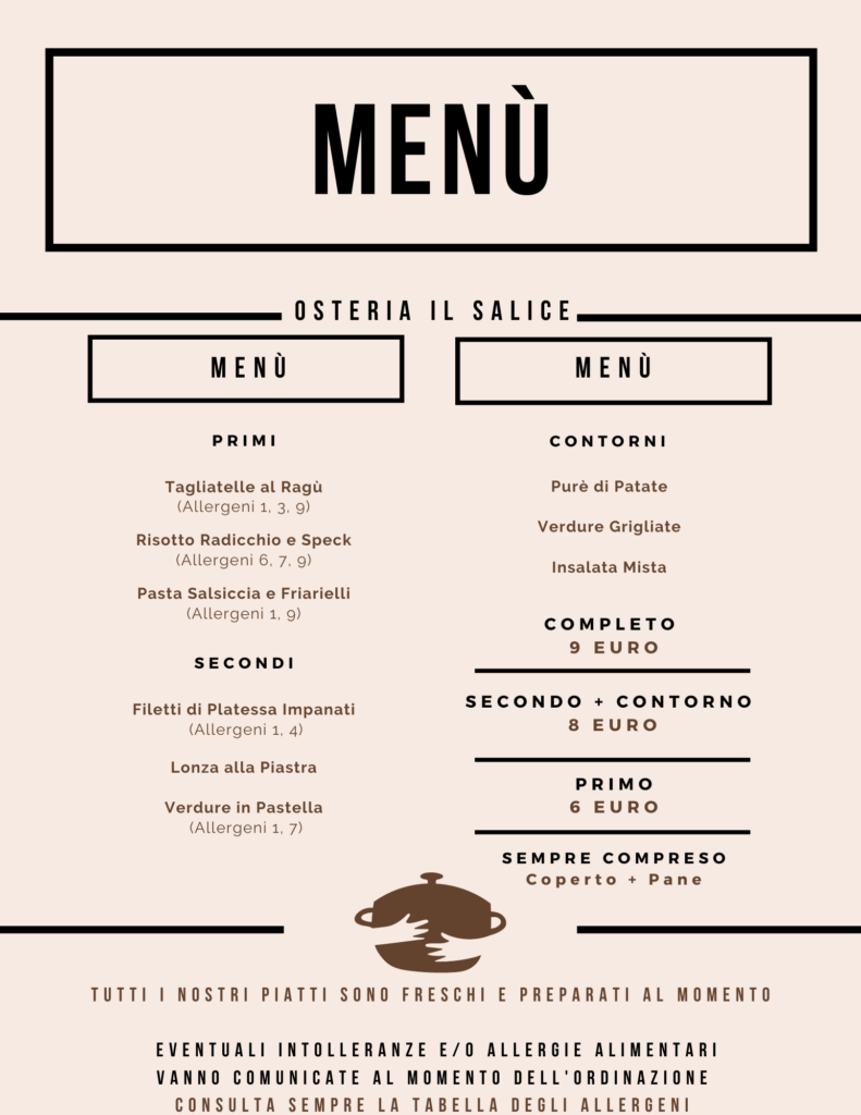 Nuovo menù settimanale (da Lunedì 15 Aprile a Venerdì 19 Aprile) Posted on Aprile 15, 2024 by Max Il menù della nuova settimana? Eccolo! 😋 Ti aspettiamo dal lunedì al venerdì dalle 12.00 alle 14.30 per la tua pausa pranzo! 🍽 Per prenotazioni e informazioni puoi chiamare il n. 0331458949 o il n. 3403830971 ☎️ Altri articoli di interesse: Osteria Il Salice: il primo menù! Il nuovo menù settimanale per la pausa pranzo (da lunedì 29 a venerdì 3 dicembre) Nuovo menù settimanale (da Lunedì 5 Febbraio a Venerdì 9 febbraio) Nuovo menù settimanale (da Lunedì 4 Marzo a Venerdì 8 Marzo)
