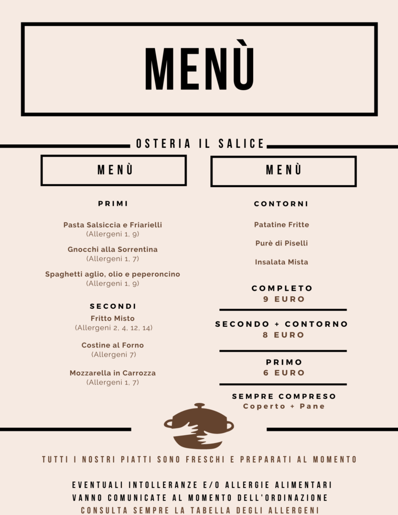 Nuovo menù settimanale (da Lunedì 18 Marzo a Venerdì 22 Marzo) Posted on Marzo 18, 2024 by Max Il menù della nuova settimana? Eccolo! 😋 Ti aspettiamo dal lunedì al venerdì dalle 12.00 alle 14.30 per la tua pausa pranzo! 🍽 Per prenotazioni e informazioni puoi chiamare il n. 0331458949 o il n. 3403830971 ☎️ Altri articoli di interesse: Venerdì 30 luglio: Cena Ligure e tributo a De Andrè Nuovo menù settimanale dell’Osteria Il Salice Nuovo menù settimanale (da Lunedì 30 Ottobre a Venerdì 3 Novembre) Nuovo menù settimanale (da Lunedì 19 Febbraio a Venerdì 23 febbraio)