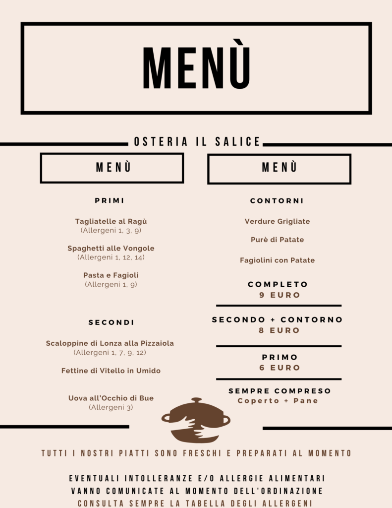 Nuovo menù settimanale (da Lunedì 27 Gennaio a Venerdì 31 Gennaio) Posted on Gennaio 27, 2025 by Max Il menù della nuova settimana? Eccolo! 😋 Ti aspettiamo dal lunedì al venerdì dalle 12.00 alle 14.30 per la tua pausa pranzo! 🍽 ☎️ Per prenotazioni e informazioni puoi chiamare il n. 0331458949 o il n. 3403830971 Altri articoli di interesse: Da Lunedì 10 gennaio riparte il servizio pranzo dell’Osteria Il Salice Nuovo menù settimanale (da Lunedì 10 Giugno a Venerdì 14 Giugno) Nuovo menù settimanale (da Lunedì 15 Luglio a Venerdì 19 Luglio) Nuovo menù settimanale (da Lunedì 20 Gennaio a Venerdì 24 Gennaio)