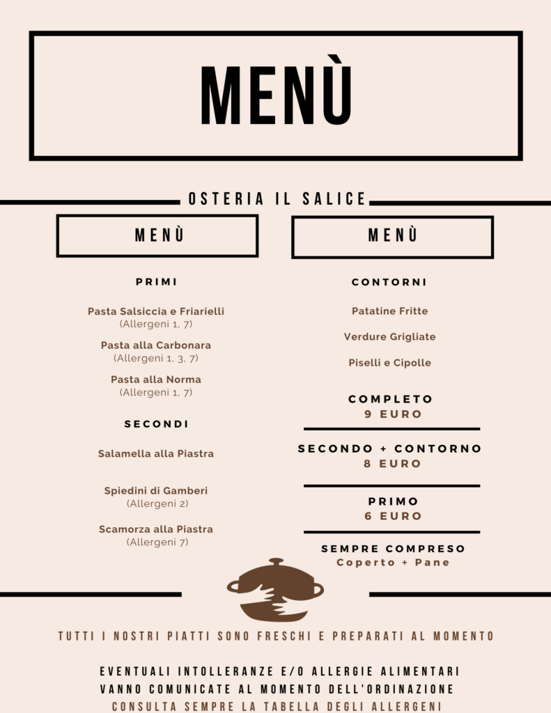 Nuovo menù settimanale (da Lunedì 29 Aprile a Venerdì 3 Maggio) Posted on Aprile 29, 2024 by Max Il menù della nuova settimana? Eccolo! 😋 Ti aspettiamo dal lunedì al venerdì dalle 12.00 alle 14.30 per la tua pausa pranzo! 🍽 Per prenotazioni e informazioni puoi chiamare il n. 0331458949 o il n. 3403830971 ☎️ Altri articoli di interesse: Orari Osteria/Bar durante il periodo natalizio Il nuovo menù dell’Osteria il Salice (da lunedì 14 a venerdì 18 febbraio) Nuovo menù settimanale (da Lunedì 11 dicembre a Venerdì 15 dicembre) Nuovo menù settimanale (da Lunedì 18 Marzo a Venerdì 22 Marzo)