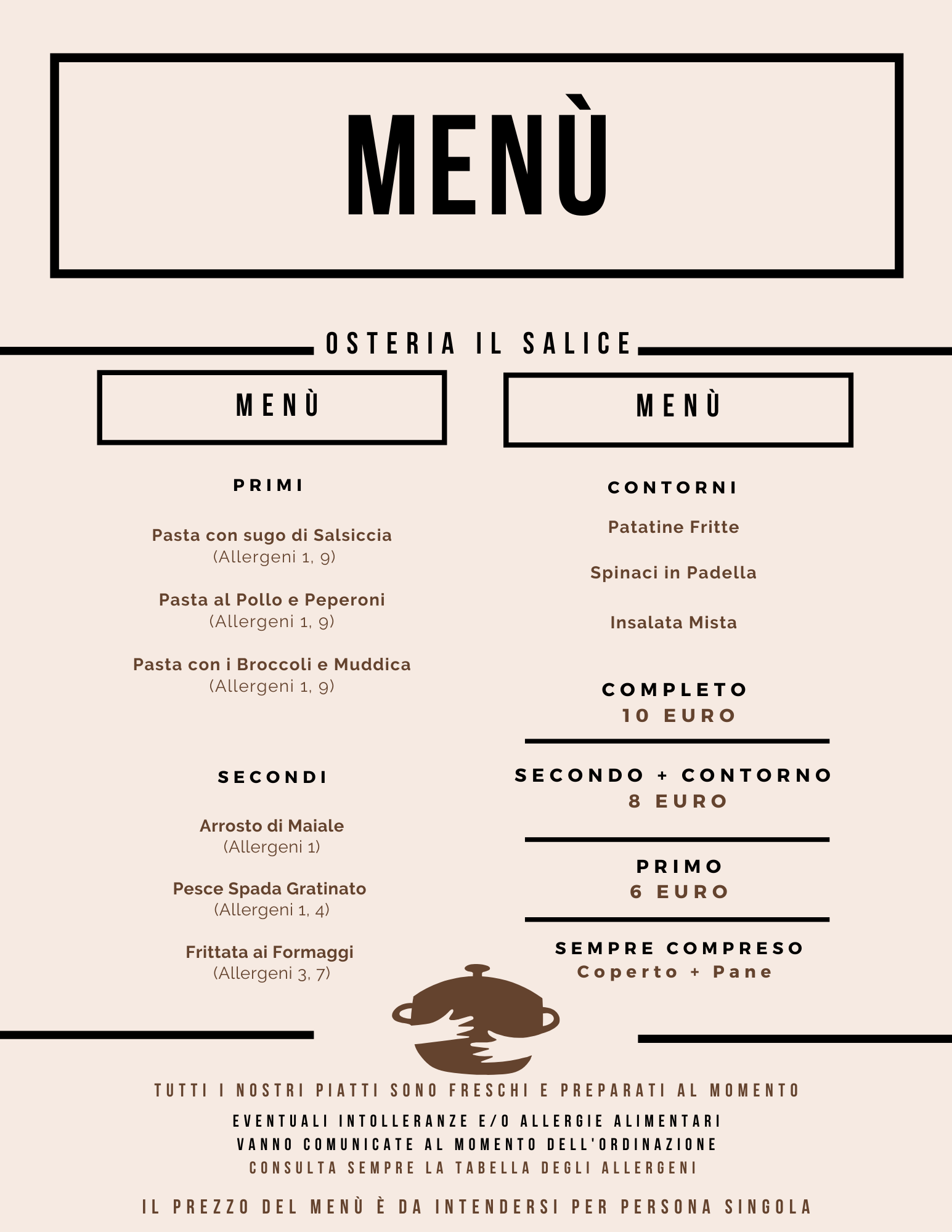 Nuovo menù settimanale (da Martedì 15 Dicembre a Venerdì 19 Dicembre) Posted on Dicembre 15, 2025 by Max Il menù della nuova settimana? Eccolo! 😋 Ti aspettiamo dal lunedì al venerdì dalle 12.00 alle 14.00 per la tua pausa pranzo! 🍽 ☎️ Per prenotazioni e informazioni puoi chiamare il n. 0331458949 o il n. 3403830971 Altri articoli di interesse: Sabato 12 Giugno: tributo a Battisti e Cena Romana OSTERIA IL SALICE: da novembre più buona che mai! Nuovo menù settimanale (da Lunedì 11 dicembre a Venerdì 15 dicembre) Nuovo menù settimanale (da Lunedì 17 Febbraio a Venerdì 21 Febbraio)
