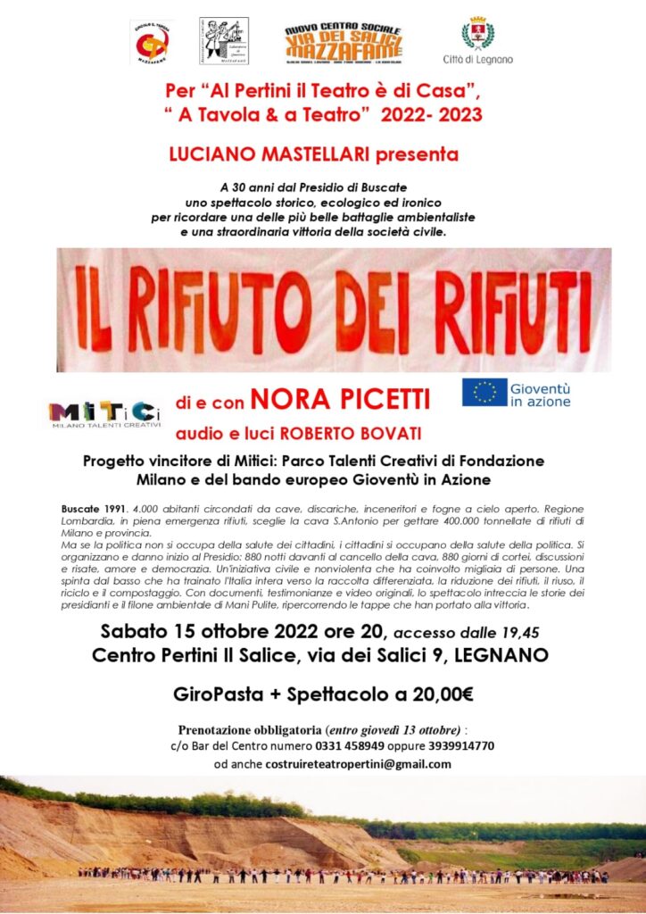ℹ️ Buscate 1991 – 4.000 abitanti Circondati da cave, discariche, inceneritori e fogne a cielo aperto. Regione Lombardia, in piena emergenza rifiuti, sceglie la cava J.Antonio per gettare 400.000 tonnellate di rifiuti a Milano e provincia Ma se la politica non si occupa della salute dei cittadini, i cittadini si occupano della salute della politica organizzano e danno inizio al Presidio: 880 notti davanti al cancello della cava, 880 giorni di cortei, discussioni e risate, amore e democrazia. Un’iniziativa civile e non violenta che ha coinvolto migliaia di persone. Una spinta dal basso che ha trainato l’Italia intera verso la raccolta differenziata, la riduzione dei rifiuti, il riuso, riciclo e il compostaggio. Con documenti, testimonianze e video originali, lo spettacolo intreccia le storie dei presidianti e il filone ambientale di Mani Pulite, ripercorrendo le tappe che han portato alla vittoria.