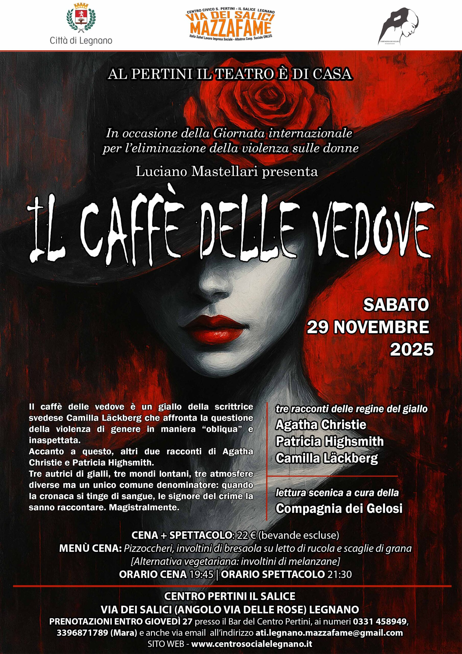 ℹ️ Il caffè delle vedove è un racconto della scrittrice svedese Camilla Läckberg. È un giallo che affronta la questione della violenza di genere in maniera “obliqua” e – come accade nei migliori gialli – in maniera inaspettata. Con questa proposta i Gelosi tratteranno la tematica dal punto di vista narrativo anziché della cronaca, ma sempre in modo efficace. Accanto a questo altri due racconti di Agatha Christie e Patricia Highsmith. Tre autrici di gialli, tre mondi lontani, tre atmosfere diverse ma un unico comune denominatore: quando la cronaca si tinge di sangue, le signore del crime la sanno raccontare. Magistralmente.