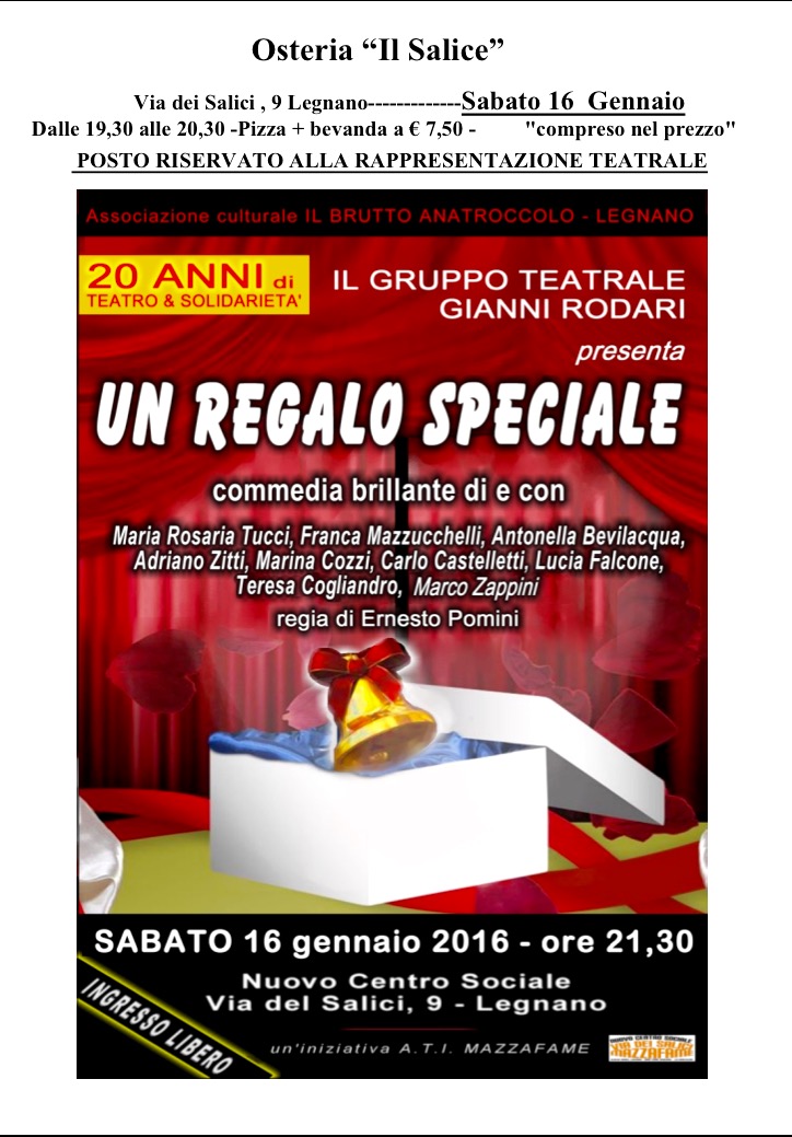 Sabato 16 Gennaio dalle 21:30 il gruppo Teatrale Gianni Rodari presenta l’Opera teatrale: “UN REGALO SPECIALE”.
