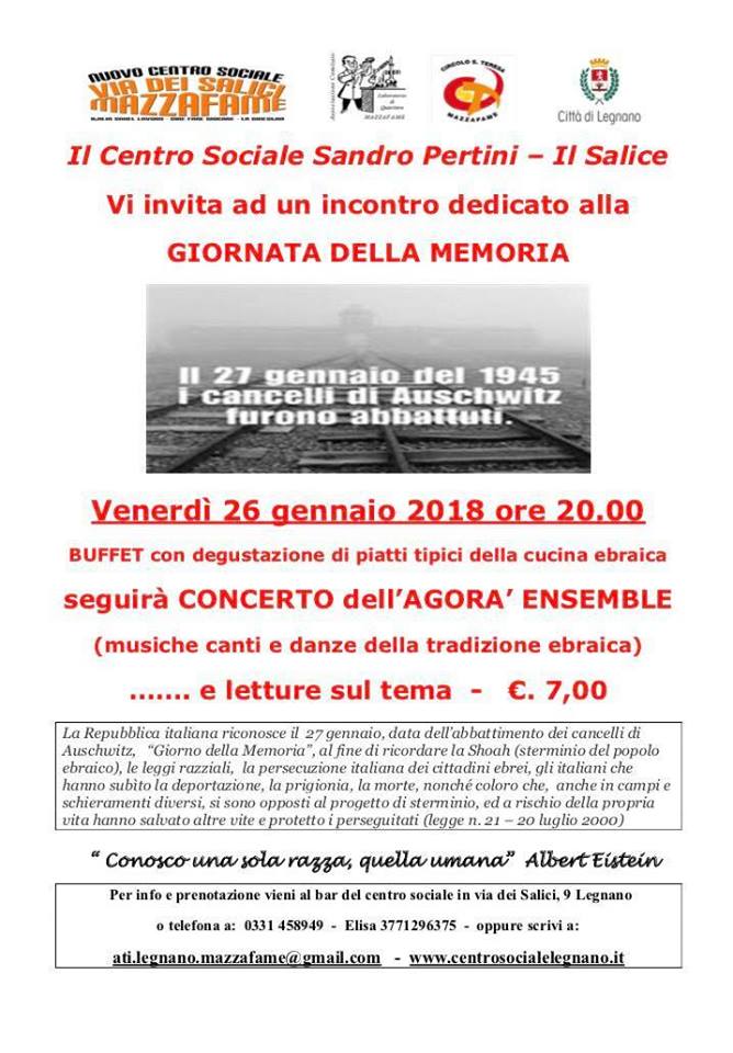 In occasione della GIORNATA DELLA MEMORIA, il Centro Sociale Pertini – Salice è lieto di invitarvi a quest’incontro che si terrà domani presso il nostro centro sociale.
