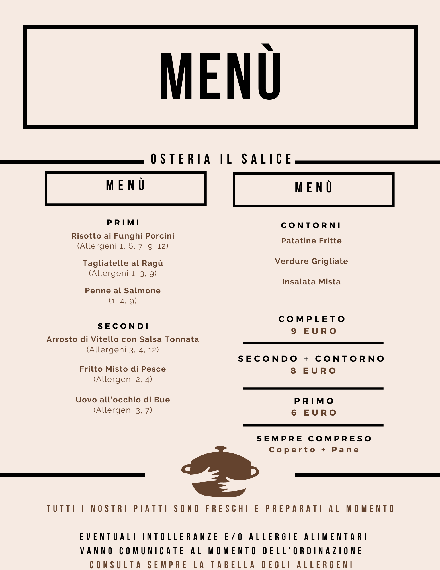 Nuovo menù settimanale (da Lunedì 12 Febbraio a Venerdì 16 febbraio) Posted on Febbraio 11, 2024 by Max Il menù della nuova settimana? Eccolo! 😋 Ti aspettiamo dal lunedì al venerdì dalle 12.00 alle 14.30 per la tua pausa pranzo! 🍽 Per prenotazioni e informazioni puoi chiamare il n. 0331458949 o il n. 3403830971 ☎️ Altri articoli di interesse: Menù Pizza Orari Osteria/Bar durante il periodo natalizio Nuovo menù settimanale dell’Osteria Il Salice Nuovo menù settimanale (da Lunedì 23 Ottobre a Venerdì 27 Ottobre)