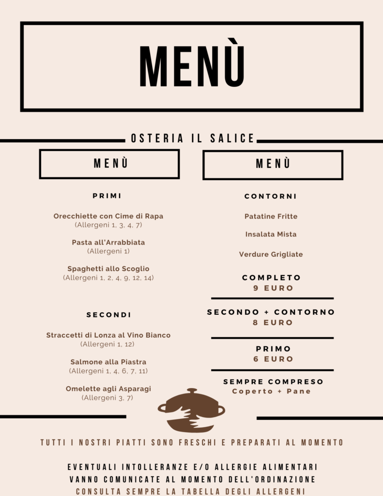 Nuovo menù settimanale (da Lunedì 4 Novembre a Venerdì 8 Novembre) Posted on Novembre 4, 2024 by Max Il menù della nuova settimana? Eccolo! 😋 Ti aspettiamo dal lunedì al venerdì dalle 12.00 alle 14.30 per la tua pausa pranzo! 🍽 ☎️ Per prenotazioni e informazioni puoi chiamare il n. 0331458949 o il n. 3403830971 Altri articoli di interesse: Sabato 10 luglio: Tributo a GUCCINI e cena Emiliana Il nuovo menù settimanale per la pausa pranzo (da lunedì 22 a venerdì 26 novembre) Nuovo menù settimanale (da Lunedì 4 Aprile a Venerdì 8 Aprile) Nuovo menù settimanale (da Lunedì 22 Gennaio a Venerdì 26 gennaio)