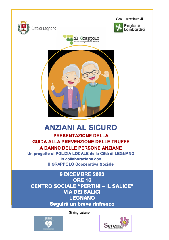 SABATO 9 DICEMBRE alle ore 16 a cura della cooperativa IL GRAPPOLO e della POLIZIA LOCALE di LEGNANO al Centro Sociale Pertini – Salice si terrà “ANZIANI AL SICURO”, con una presentazione della GUIDA ALLA PREVENZIONE DELLE TRUFFE A DANNO DELLE PERSONE ANZIANE 👴🧓
